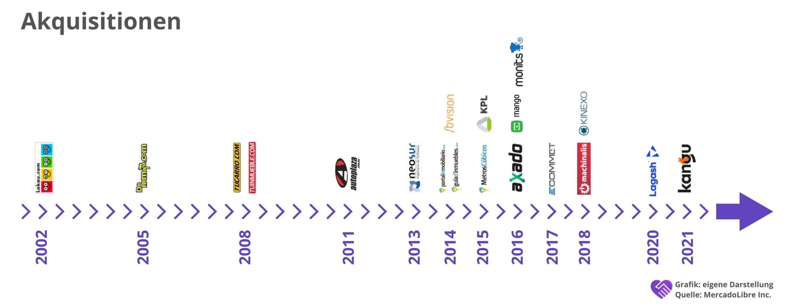 Die Wachstumsstrategie von Mercado Libre inkludiert neben Investitionen in Start-ups (mehr dazu im Geschäftsmodell unter Mercado Libre Fund) auch regelmäßige Übernahmen. Solche wurden in der Vergangenheit immer wieder getätigt. Hier ein kleiner Überblick der wichtigsten Akquisitionen: