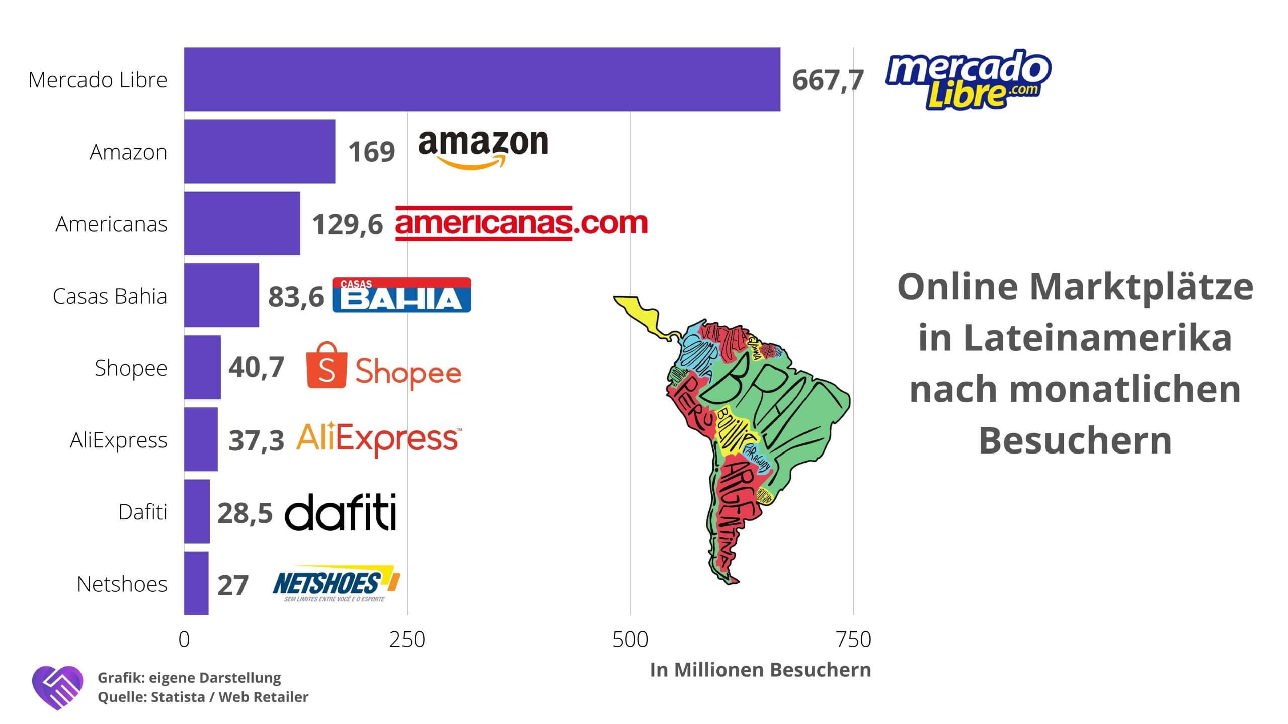 Der Unterschied ist jedoch, dass das Unternehmen in Lateinamerika eine sehr große Marktmacht besitzt und die westliche Konkurrenz im Vergleich sehr schwach ist. Die folgende Abbildung mit den beliebtesten Online-Shops nach monatlichen Besuchern in Südamerika zeigt das relativ deutlich. Mehr als eine halbe Milliarde Besucher kann der Konzern verzeichnen, während der US-Gigant Amazon nur auf 169 Millionen kommt.