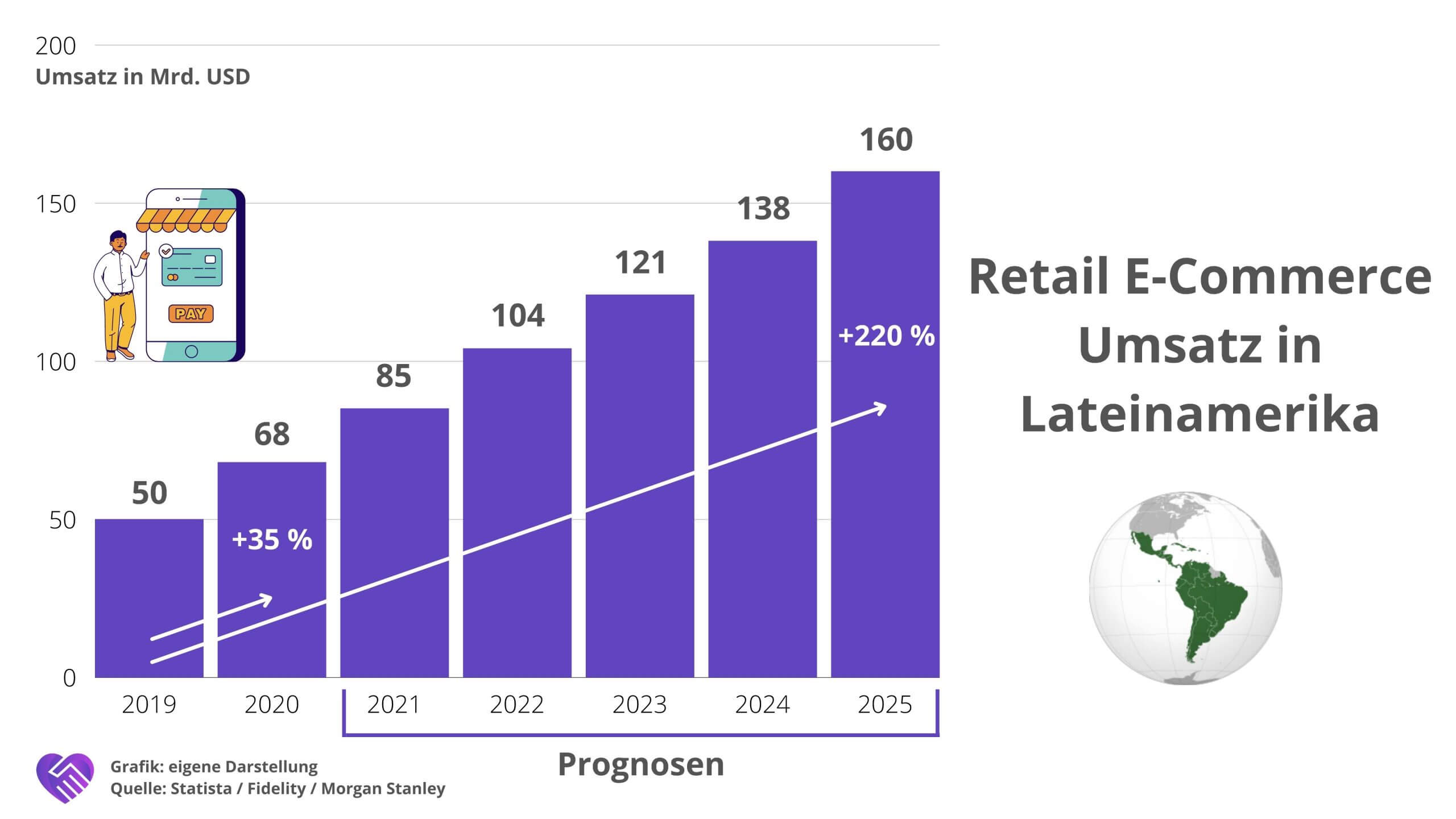 Für ein korrektes Verständnis der Stärke von Mercado Libre ist es wichtig das Geschäftsmodell und die Marktmacht vor Augen zu haben. Die Digitalisierung in Südamerika ist weit hinter der von westlichen Ländern, was dem Konzern weitere große Wachstumschancen eröffnet. Wächst die Wirtschaft in den zum Teil noch unterentwickelten Ländern, dann sorgt der Wohlstand der Bevölkerung für einen Wachstum von „Luxusangeboten“, wie bspw. E-Commerce Shops. Allein von 2019 auf 2020 wuchs der Markt um 35 %, bis 2025 wird von Morgan Stanley ein Wachstum von über 200 % prognostiziert.
