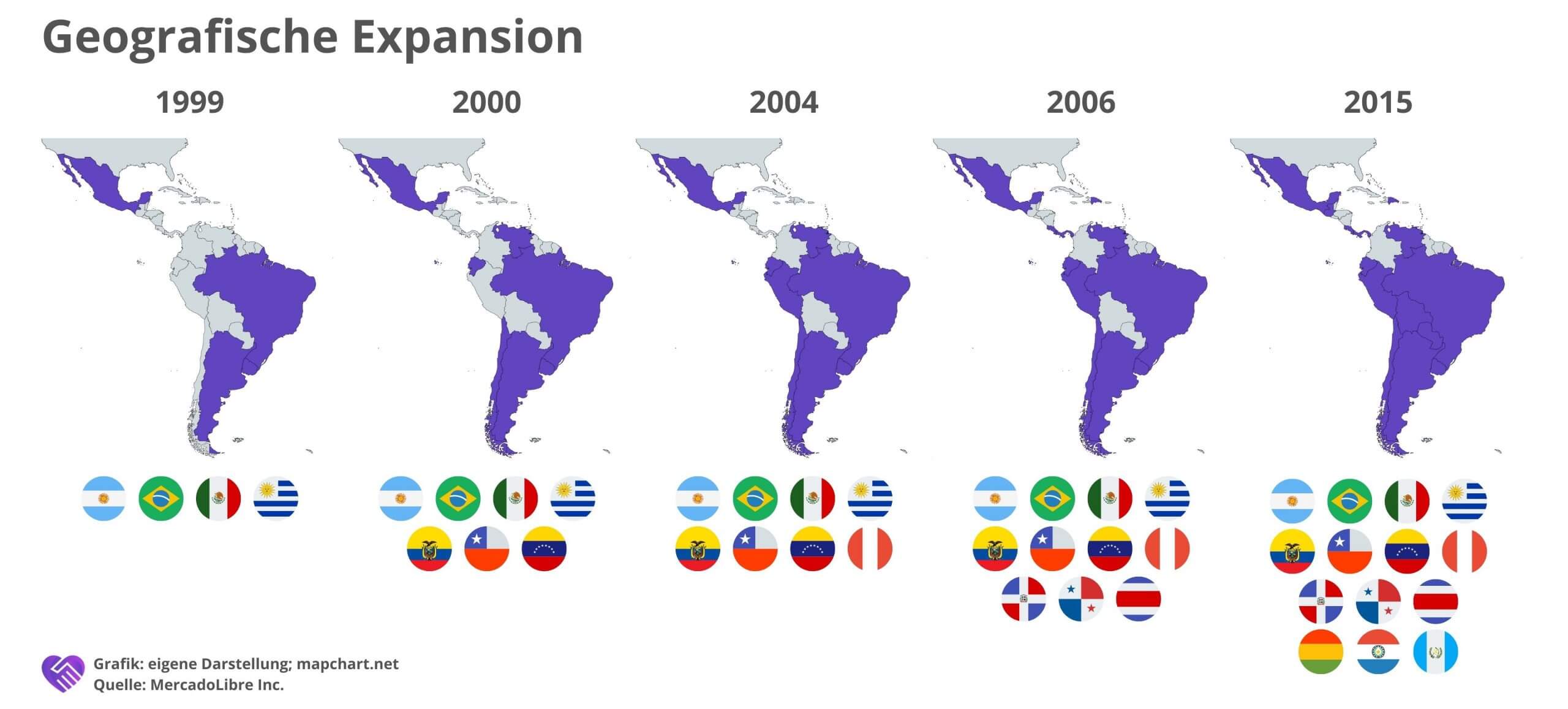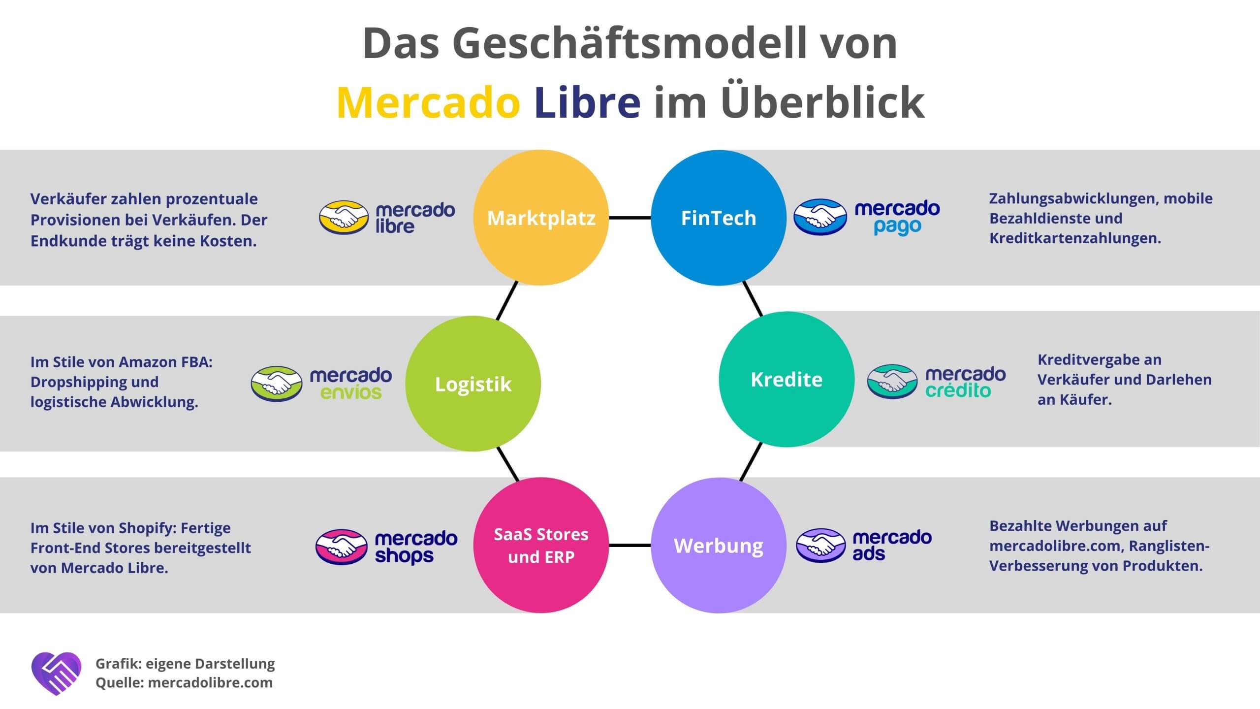 Das Kerngeschäft von Mercado Libre, der Online-Marktplatz, wurde stetig erweitert. Bereits nach wenigen Jahren (2003) stieg man in den Fintech-Bereich mit Mercado Pago ein. Hinzu kamen Mercado Ads (Werbegeschäft) in 2009, Mercado Shops (Software-as-a-Service-Läden und Ressourcenplanung für Unternehmen) in 2010, Mercado Envios (Logistik) in 2013 und Mercado Crédito (Kredit) in 2017. Mehr zu den einzelnen Sparten erfährst du im Geschäftsmodell.